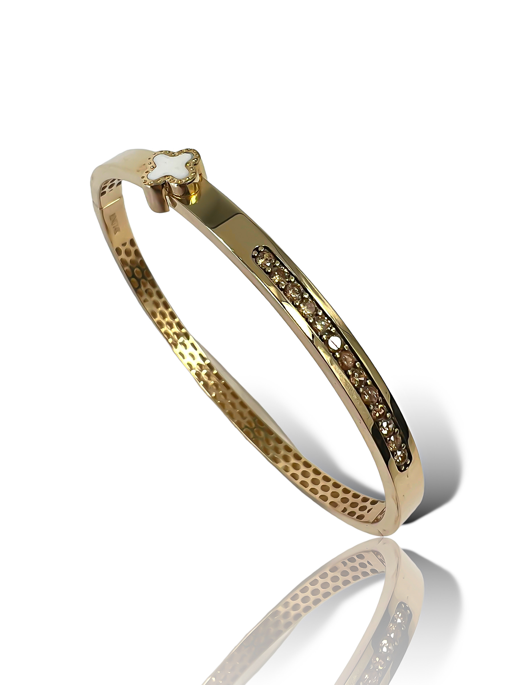 Byzylyku ari 14 karat në formë lule i markës Van Cleef & Arpels, i mbuluar me gurë të bardhë, i kombinuar me dy lloje të ngjyrave shampanje dhe kafe është një bizhuteri e mrekullueshme dhe shumë e rafinuar. Ky byzylyk ka një dizajn shumë të hollë dhe të delikatë, duke formuar një lule me 5 lule të vogla. Gurët e vendosur në byzylyk janë të bardhë dhe të llojeve të ngjyrave shampanje dhe kafe, duke krijuar një harmoni të mrekullueshme të ngjyrave dhe formave.Byzylyku është bërë nga ari i rafinuar në nivelin 14 karat, i cili është një shumë e zakonshme në industrinë e bizhuterisë për shkak të rezistencës dhe vlerës së tij të lartë. Marka Van Cleef & Arpels është një nga markat më të njohura në botën e bizhuterive dhe kjo bizhuteri është një mjeshtëri e vërtetë e punës së artit.Ky lloj byzylyku është i përshtatshëm për ngjarje të ndryshme si dasma, mbrëmje formale apo edhe një darkë romantike. Ai mund të jetë një dhuratë e shkëlqyeshme për një person të dashur, ose mund të jetë një bizhuteri e veçantë për tu përdorur në raste të veçanta.