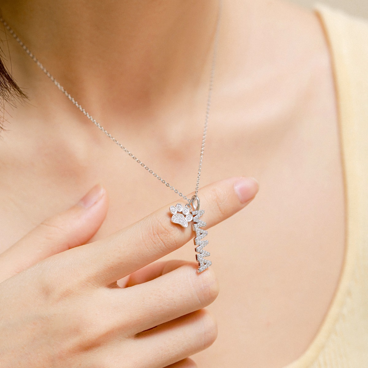 Qafore Argjendi matriali i së cilës është i garantuar, kjo qafore vjen me 2 versione të saj të cilat janë njëra argjend e flakruar me ngjyre ari dhe tjetra argjend me ngjyre klasike. Kjo qafore e ka mbishkrimin “Mama” dhe putren e qenit. Dimensioni i kësaj varsës është 30.6mm*6.4mm dhe është e mbuluar më gurë Zirconi 5A të vegjel 1mm qe e sjellin këtë varse me një shkelqim unik.