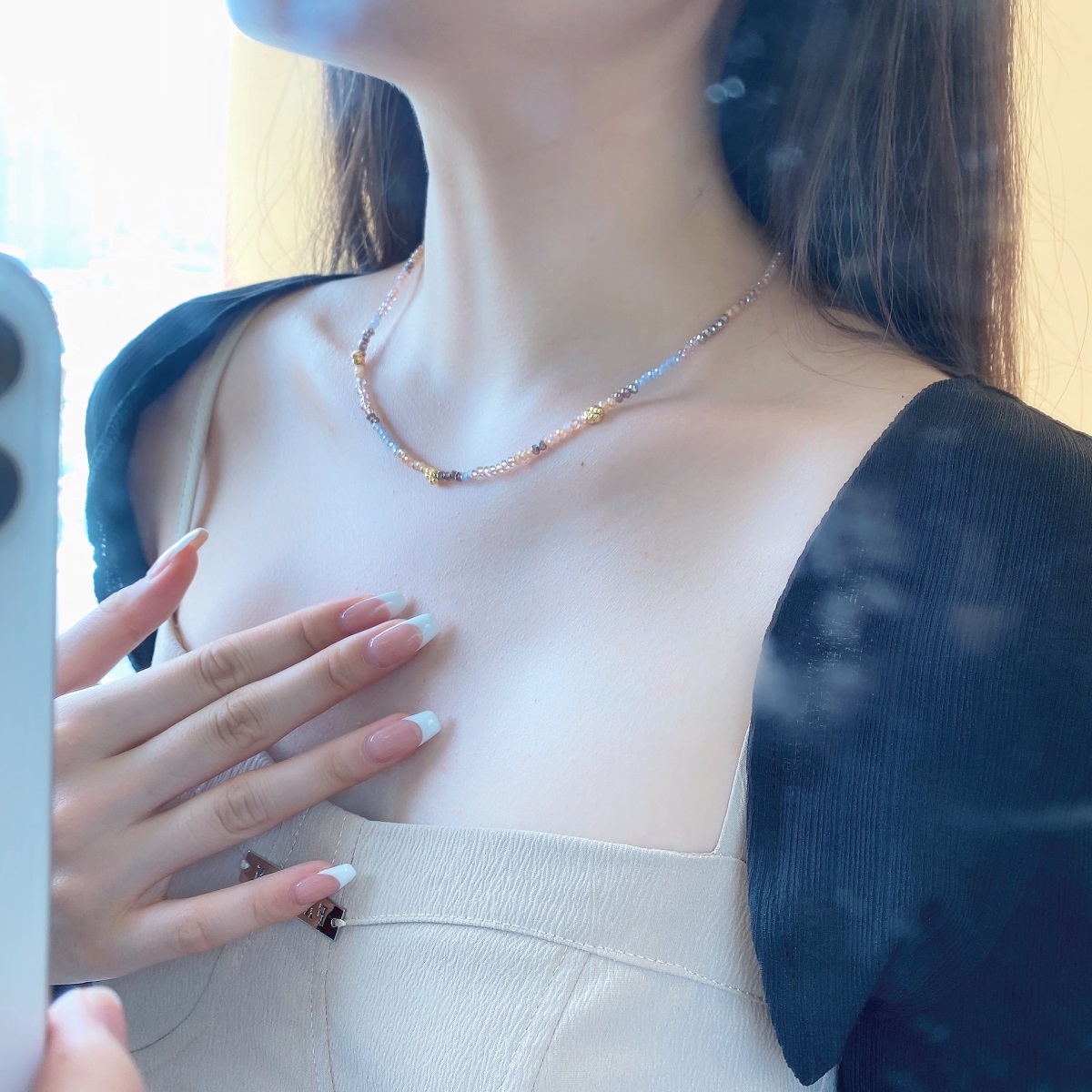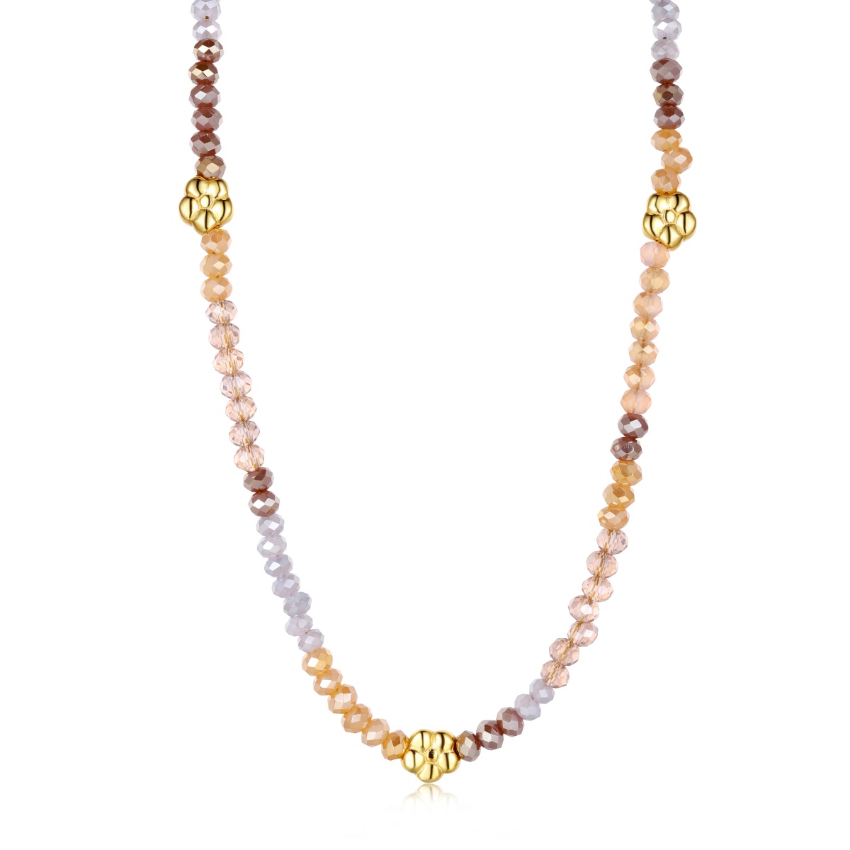 Qafore Argjendi matriali i së cilës është i garantuar, kjo qafore është e punuar punëdore e cila brenda një zingjiri të argjendit kemi kombinuar gurë natyral të ndryshum me ngjyra të ndryshme të cilat ndahen ne mesin e saj nga një lulë e punuar nga argjendi e flakruar me ngjyre ari. Qaforja ka gjatësin 43cm.