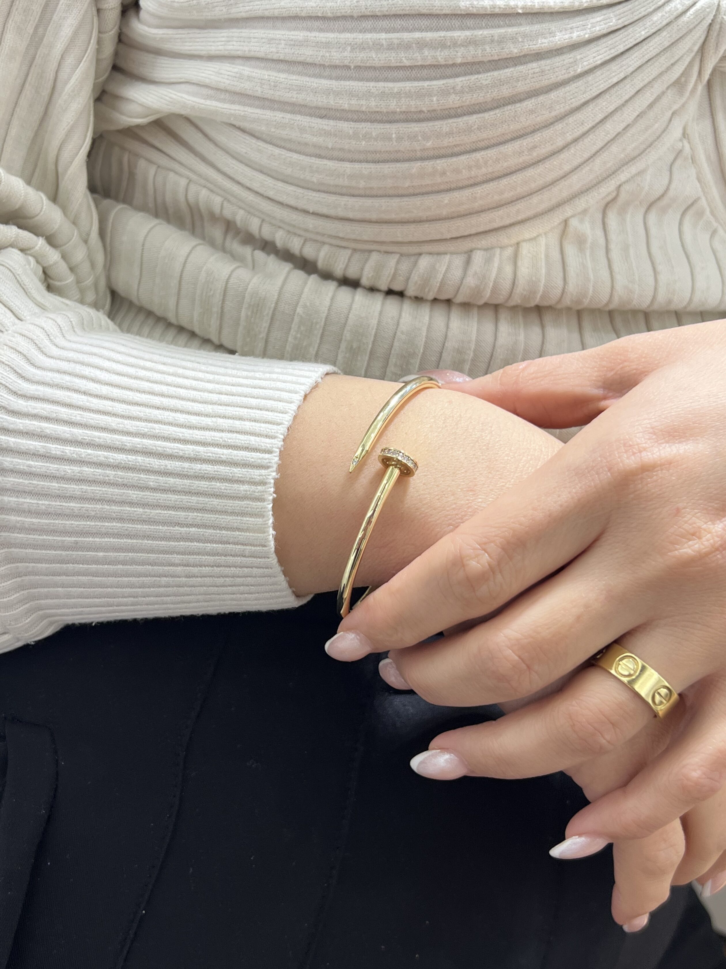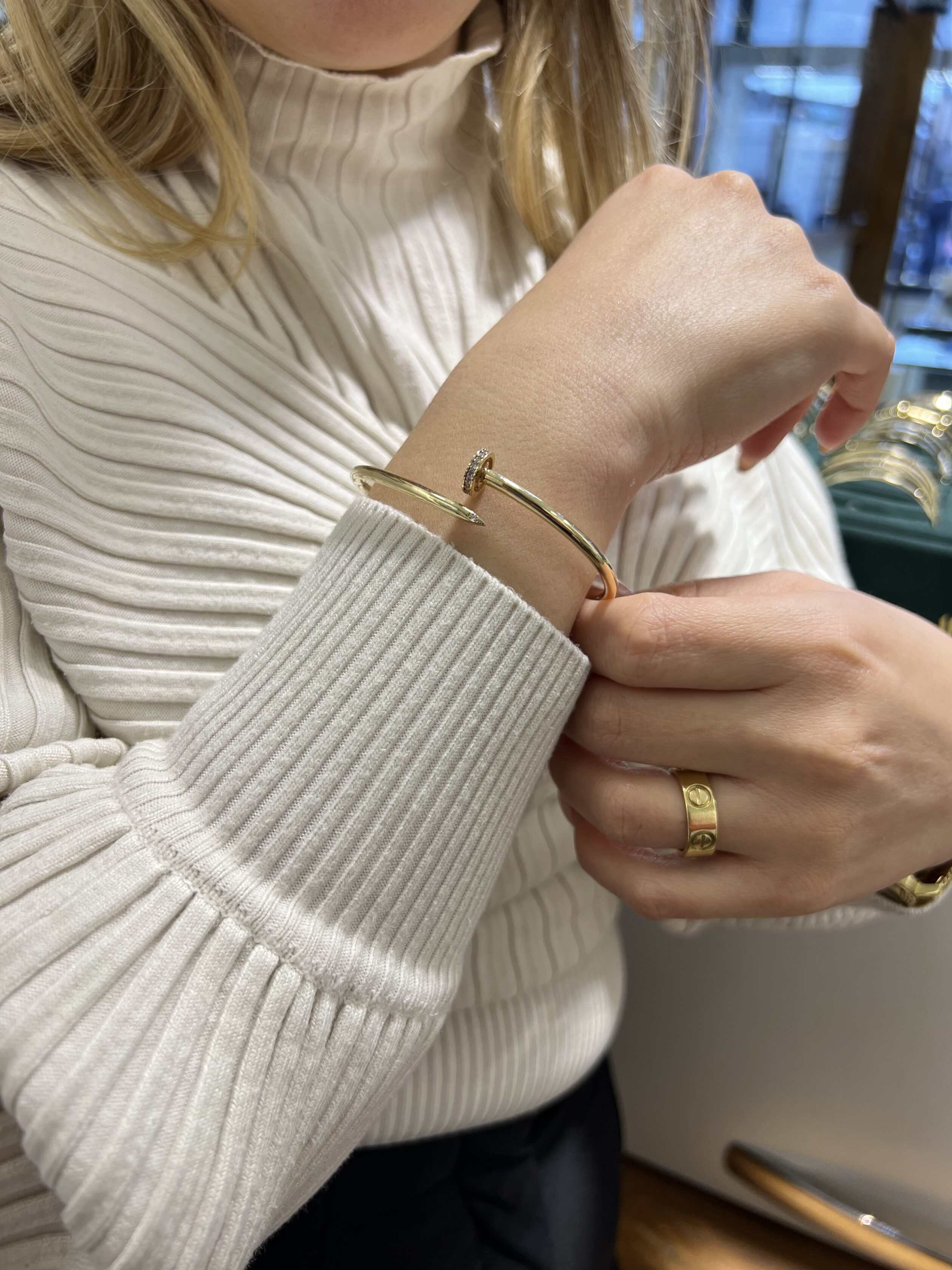 Byzylyku ari 14 karat i markës Cartier, modeli i së cilës është në formë gozhde, është një aksesor i bukur dhe i rafinuar për meshkuj dhe femra. Kjo markë është një emër i njohur në industrinë e byzylykëve dhe ka një reputacion të mirë për cilësinë e produkteve të saj.Byzylyku është bërë nga ari 14 karat, që është një lloj ari të cilin përbërësit e tij janë 14 pjesë ari dhe 10 pjesë metali të tjerë, të cilat ndihmojnë në përmirësimin e tij dhe në ruajtjen e formës së tij. Byzylyku ka një formë gozhde, që do të thotë se ai është më i gjerë në pjesën e sipërme dhe më i ngushtë në fund.Modeli i Cartier është i dizajnuar me detaje të hollësishme dhe elegante, duke i dhënë atij një pamje të sofistikuar. Ai ka një mbushje të lehtësisë dhe elegancës, dhe është ideal për të mbuluar dorën dhe për të përfunduar një pamje të bukur. Byzylyku mund të përdoret në raste të ndryshme, siç janë mbrëmjet formale, dasmat, ose edhe për një përdorim të përditshëm për të shtuar një pikë elegancë në veshjet e përditshme.
