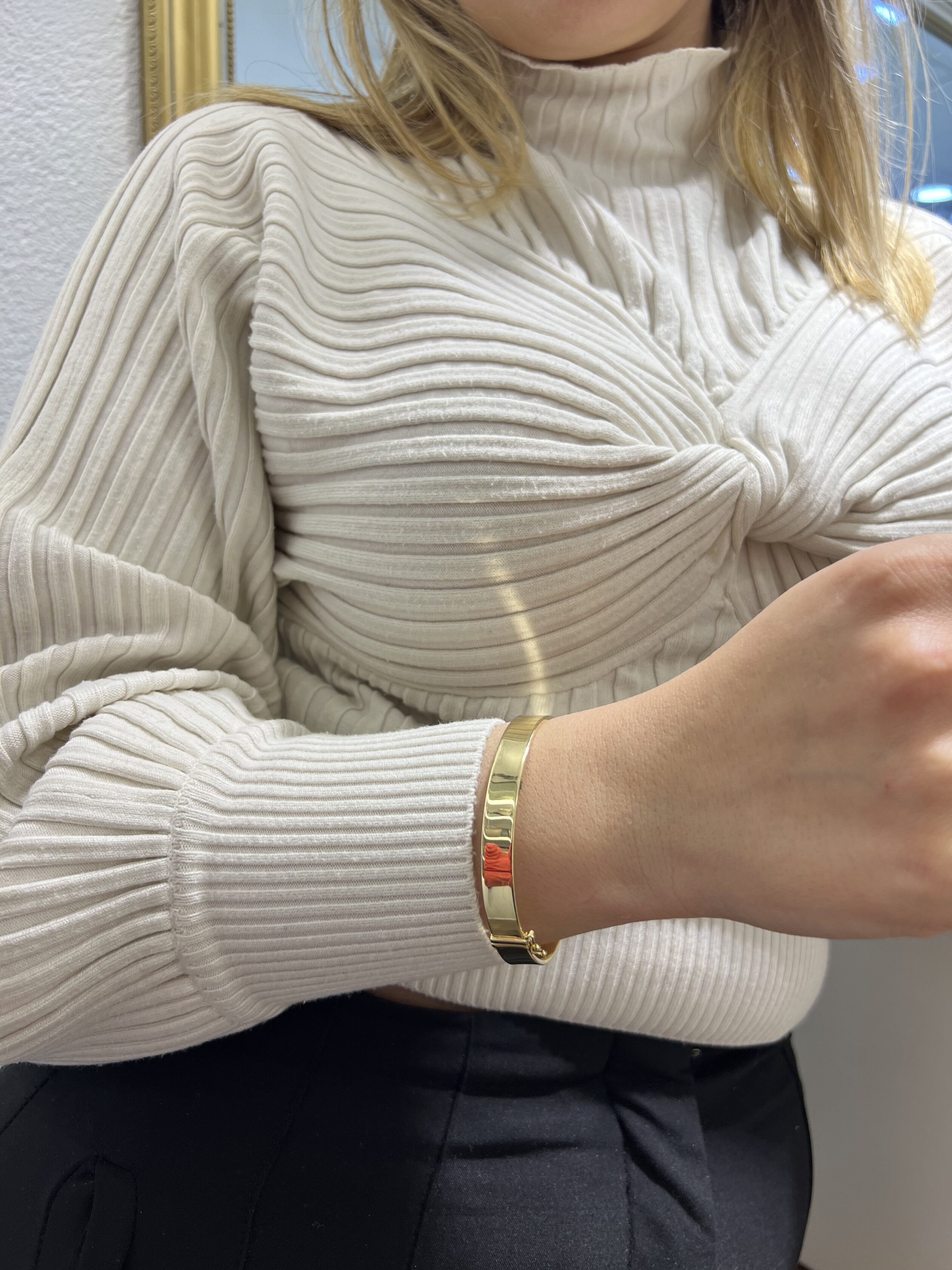 Ky byzylyk ari 14 karat i modelit klasik solid pa gurë është një byzylyk ari që nuk ka asnjë gur të vendosur në tij, dhe ka një dizajn klasik dhe të thjeshtë. Është bërë nga ari 14 karat, që është një aleacion ari të cilin i kushtohet kujdesi dhe i është dhënë një certifikatë cilësie që vërteton karatin e tij.Ky lloj byzylyku është një zgjedhje e shpeshtë për njerëzit që preferojnë dizajne më të thjeshta dhe klasike dhe që nuk do të kenë nevojë për gurë ose dekorime shtesë. Byzylyku është solid dhe nuk ka asnjë hapësirë brenda tij, që e bën më të përshtatshëm për punët apo aktivitetet që kërkojnë durabilitet dhe rezistencë.Ky lloj byzylyku ari 14 karat klasik solid pa gurë mund të jetë një zgjedhje e shkëlqyeshme për një dhuratë për një person të dashur, ose për veten tuaj si një pjese e bijuterive të zakonshme që do të përdoret në ditët e përditshme.