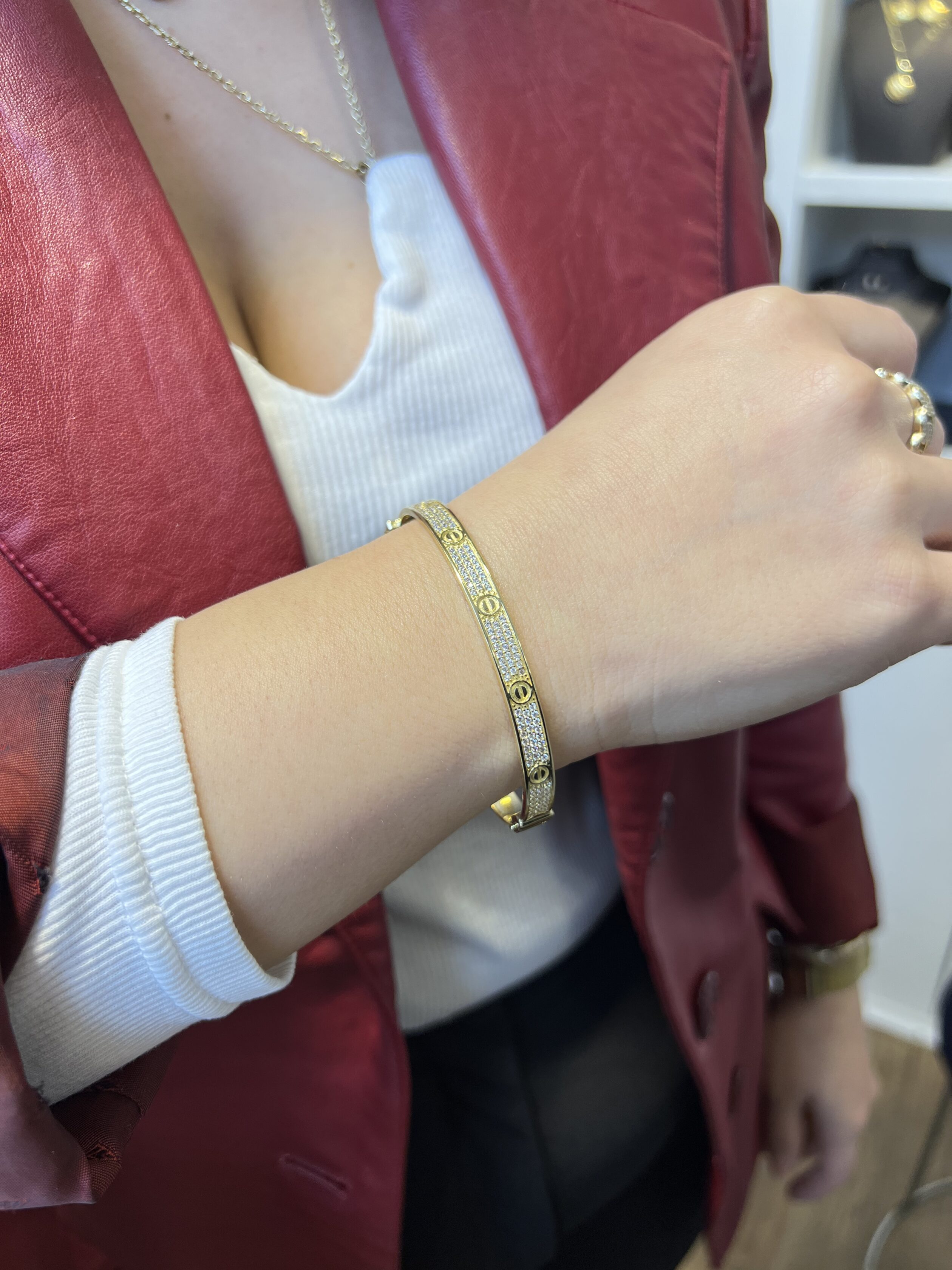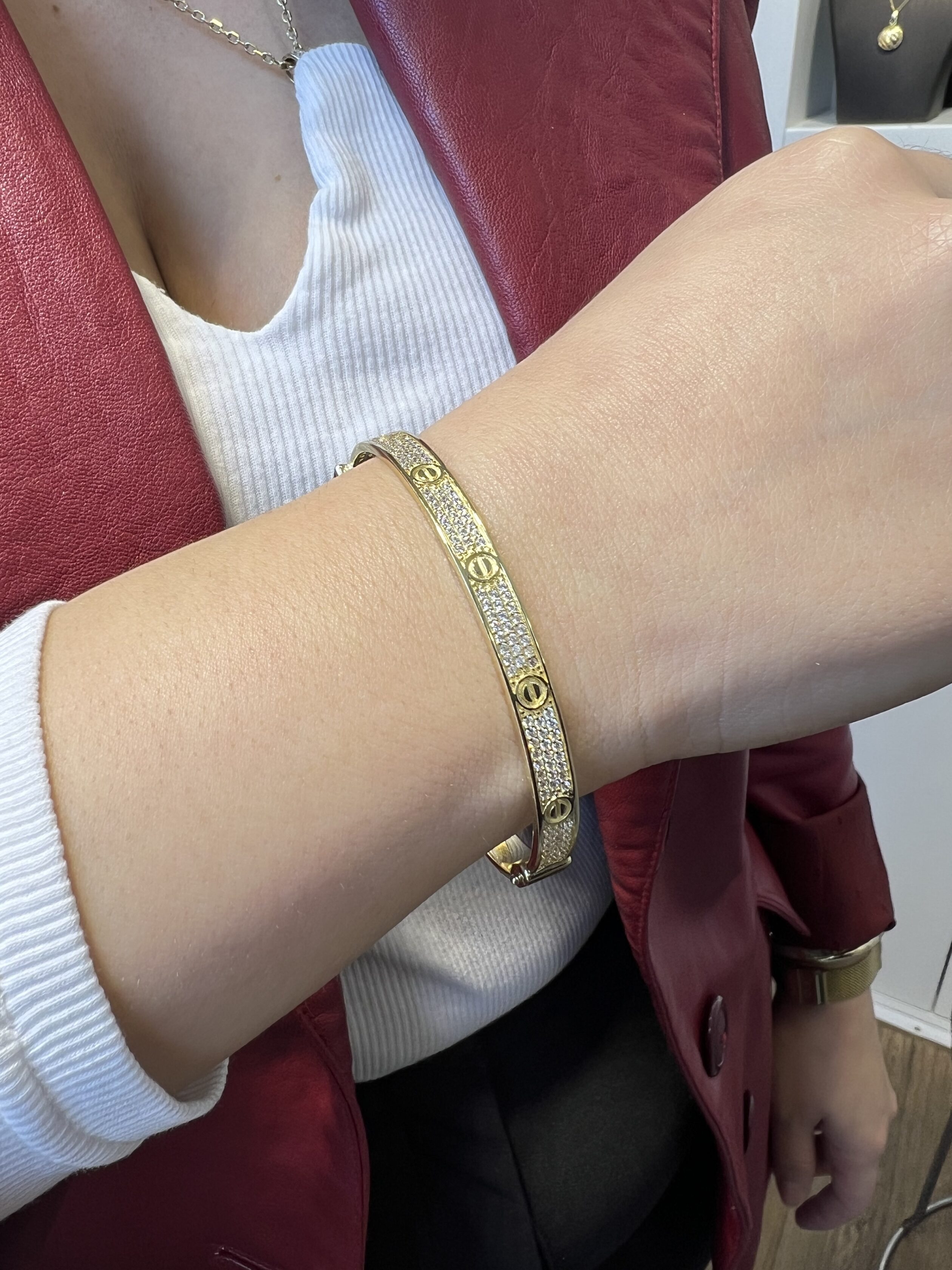Byzylyku Dore “Love” me gurë zirconi është një model i bukur dhe elegante nga Cartier, i cili është i mbuluar me gurë zirconi të madhësisë 1mm.Ky byzylyk dore është bërë nga ari i lartë 14 karat, i cili i jep atij një prejardhje italiane dhe i jep atij një pamje unike dhe të veçantë. Dizajni i tij i thjeshtë dhe elegant është shtuar me gurë zirconi të madhësisë 1mm që i bën ato tërheqëse dhe i jep atij një prekje ekstra të elegancës.Përsëri, simbolet e dizajnit të tij janë një zemër e gjallë dhe pjesët e tij të ndara, që përplasen për të formuar një simbol të dashurisë dhe afërsisë. Me shtimin e gurëve zirconi, ky byzylyk dore “Love” bëhet edhe më i veçantë dhe i bukur, duke e bërë atë ideal për veshjen në çdo rast.Gurët zirconi janë tërheqës dhe të ndritshëm, duke e bërë këtë byzylyk dore të shkëlqyeshëm në dritë. Në të njëjtën kohë, ari i lartë 14 karat dhe gurët zirconi janë të cilësisë së lartë dhe i japin atij një pamje tërheqëse dhe të butë.Në përfundim, byzylyku Dore “Love” me gurë zirconi është një produkt i veçantë dhe i bukur nga Cartier, i cili shpreh dashurinë dhe afërsinë në një mënyrë të bukur dhe të thjeshtë, duke e bërë atë ideal për t’u dhuruar si një dhuratë e bukur dhe të vlefshme për të dashurën ose për një rast të veçantë.