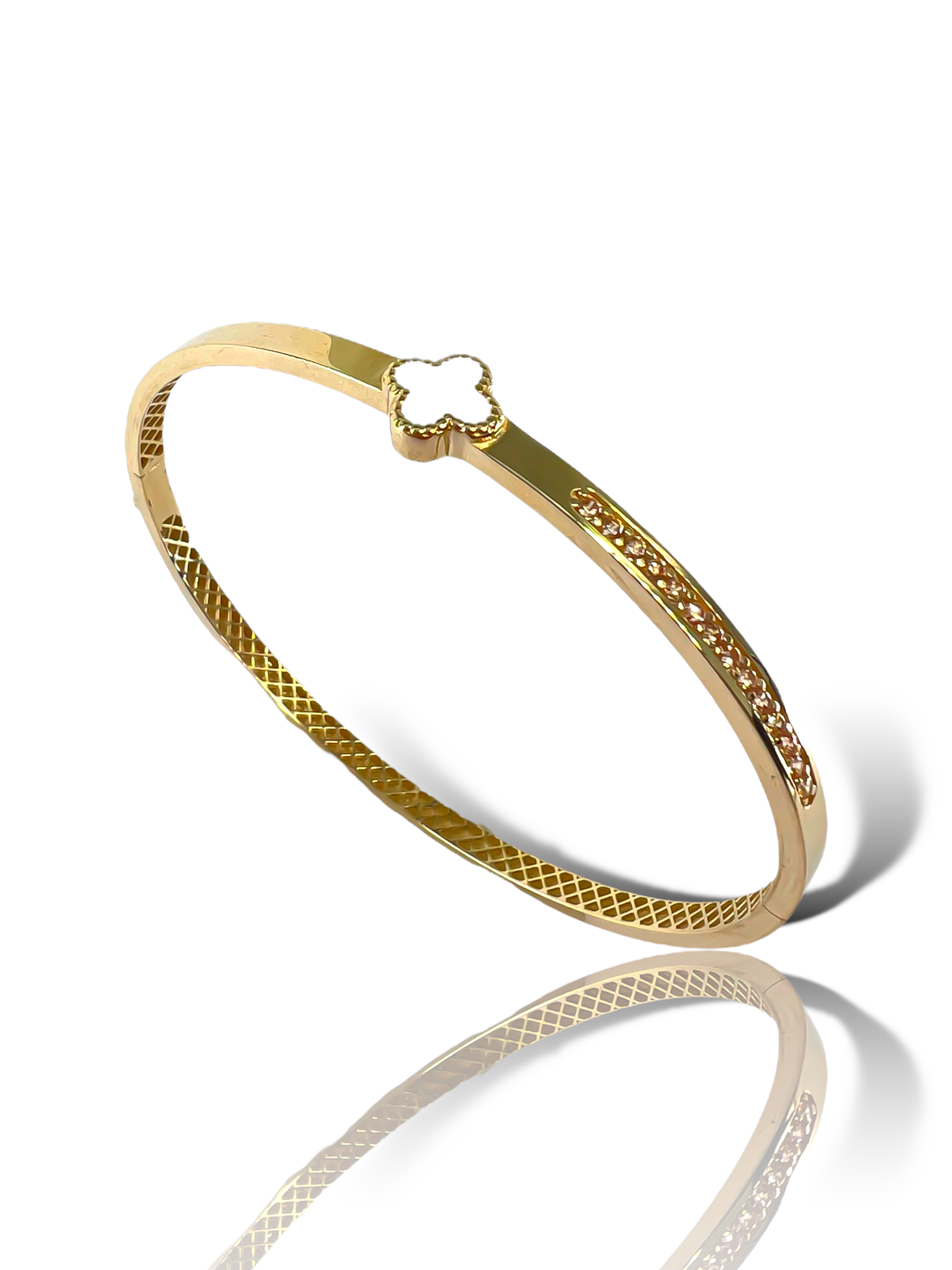 Ky Byzylyk dore 14Karat i markës Van Cleef është një krijoim elegant dhe i veçantë. Ajo ka logojen e saj të bardhë të punuar në sipërfaqen e byzylykut, e cila është e kombinuar me dy lloje të ndryshme të ngjyrave si “Kafe” dhe “Ngjyre Mjalte” e cila krijon në siperfaqe një dizajn tërheqës dhe unik.Byzylyku ka një siperfaqe të ndryshme nga ana e jashtme dhe një tjetër siperfaqe të ndryshme nga ana e brendshme. Ky kontrast i ndryshimit të siperfaqeve i jep atij një pamje të veçantë dhe tërheqëse. Siperfaqja e brendshme është e punuar me një teksturë të harkuar, e cila është shumë e ndjeshme në dorë dhe siguron një ndjesi të butë.Logoja e saj e bardhë e vendosur në mes të byzylykut është një detaj i vogël, por i rëndësishëm që i jep atij një pamje elegante dhe unike. Ajo e bën këtë byzylyk dore të shkëlqejë dhe të ndërlikohet në mënyrë subtile.Van Cleef është një markë e njohur për bizhuteritë e saj të larta cilësie dhe këtë model e bën të qartë kjo reputacion i lartë. Ky byzylyk dore është një krijoim unik, i cili është i përshtatshëm për të gjitha rastet, nga veshjet më të lehta të përditshme deri te veshjet më formale për ngjarjet më të rëndësishme.