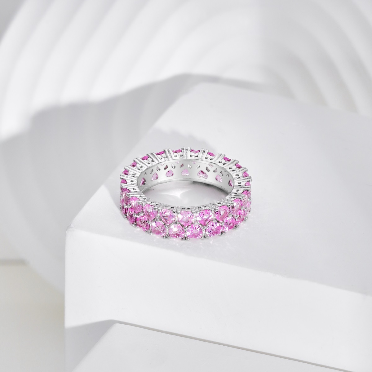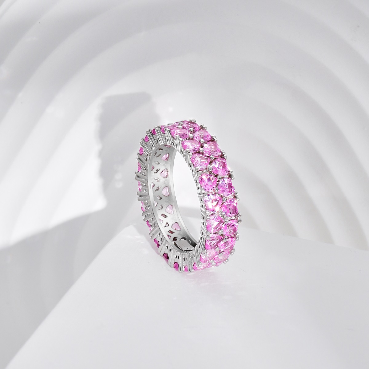 Unazë Argjendi matriali i së cilës është i garantuar, kjo unazë vjen më ndryshe se unazat tjera në një form rrethore unaza e mbuluar me gurë në formë zemre të punuar në menyre profesional dhe me një ngjyrë roze ku secila zemër ka një dimension të prerjes 3mm x 3mm, keta gurë në formë zemre janë të siguruar me vendosjen e argjendit anash tyre.