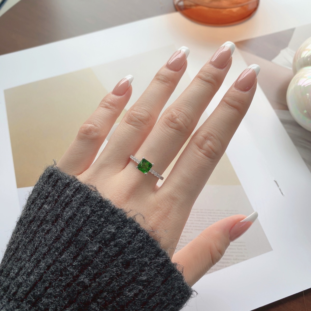 Unazë Argjendi matriali i së cilës është i garantuar, guri i unazës ka një prerje katrore me guri të gjelbertë të mbyllur i kombinuar me gurë të vegjel 1mm me ngjyrë të bardhë. Cilësia e gurëve është Zirconi 5A. Unaza është e thjeshtë dhe unike, për më shumë mund ta shikoni në fotot se si e bënë një lidhje të vecant unaza me gishtin e juaj.