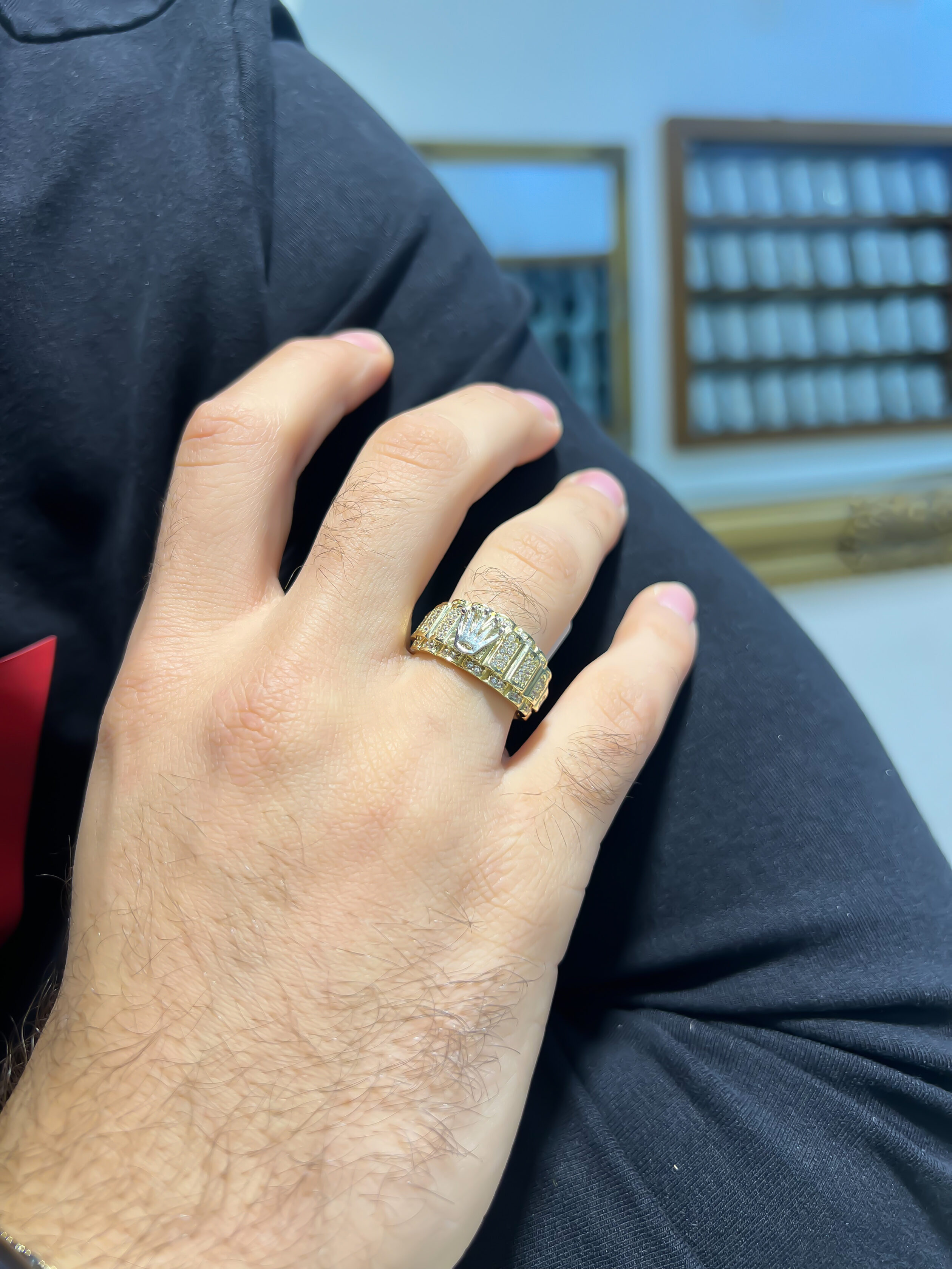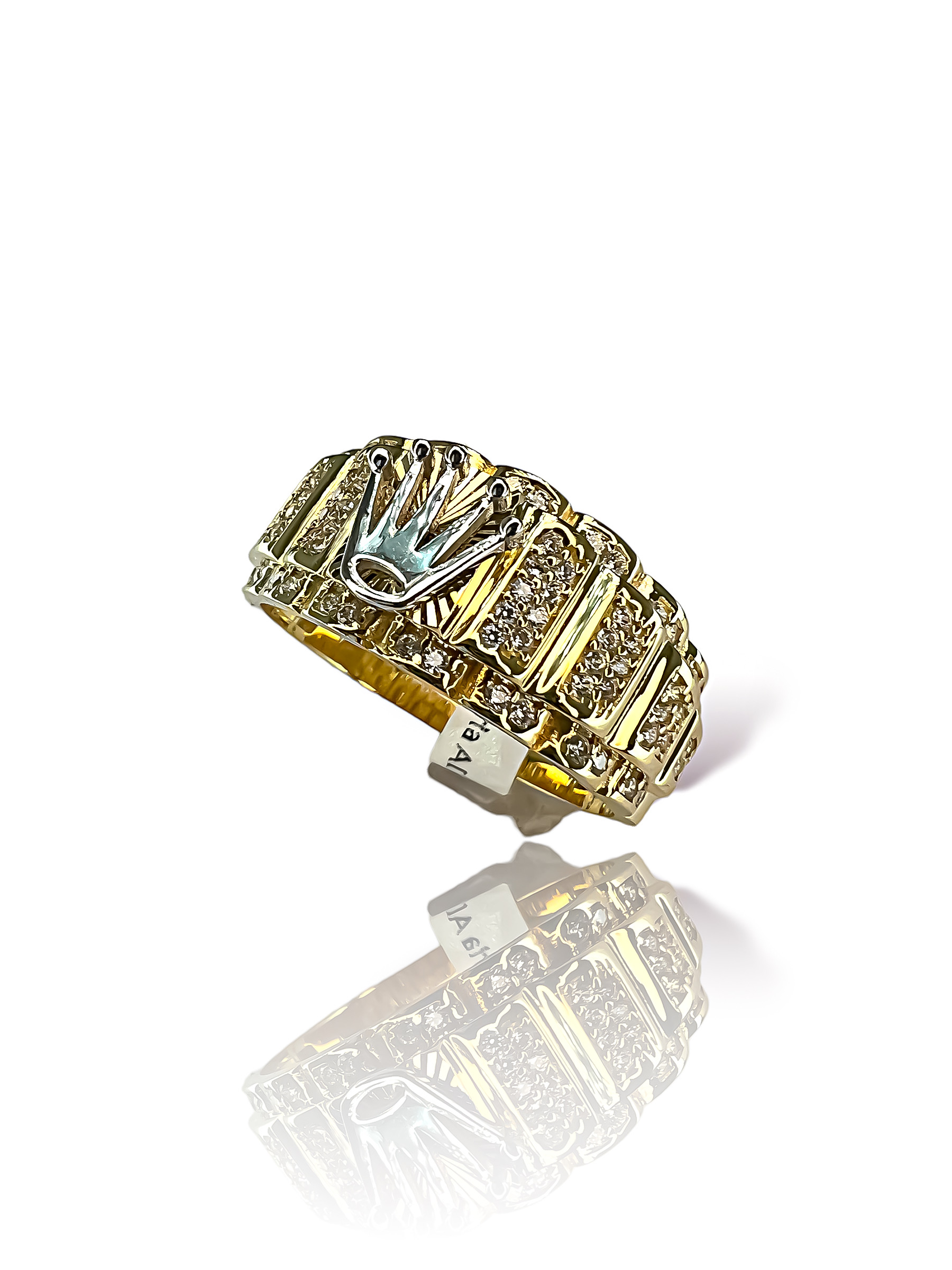 Unazë Ari për meshkujë matriali i së cilës është i garantuar 14Karat apo me shifren 585, kjo unaze e punuar në formë klasike ku në pjesën kryesore ka një një shenjë të vendosurë të Rolexit. Kjo shenjë është e punuar me Ari të bardhë,krah saj ka gurë të llojit Zirconi 5A që e sjellin një shkelqim tejet unikë. Unaza është një unazë moderne dhe klasike për të gjitha moshat.
